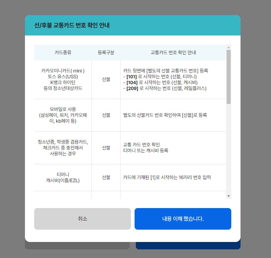 9.  교통카드의 종류가 많다 보니 갖고 있는 교통카드를 잘 확인하시고 등록하시면 됩니다. 저는 선불 티머니 교통카드였습니다.