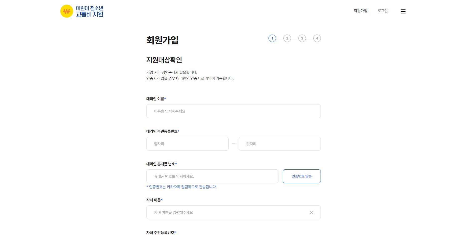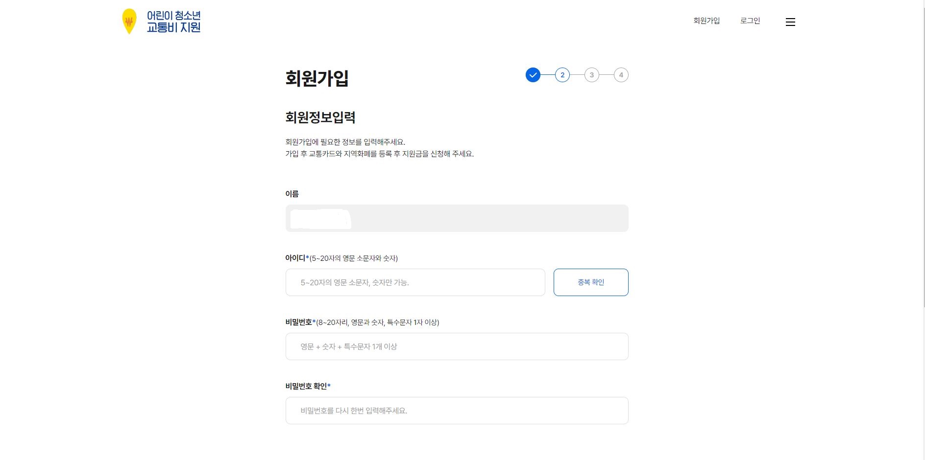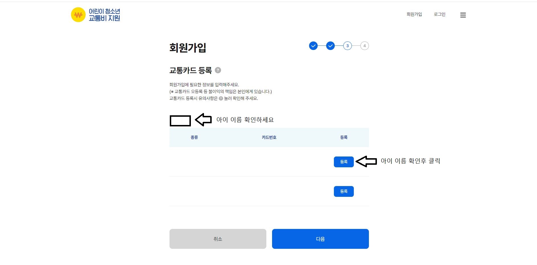 8. 회원정보 입력 후 아이 명의의 교통카드 등록을 시작합니다.