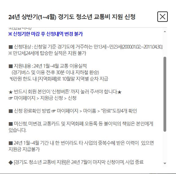 [경기도 청소년 교통비 지원] 은 24년 7월이 마지막 신청이며 사업이 종료된다고 나와있습니다.