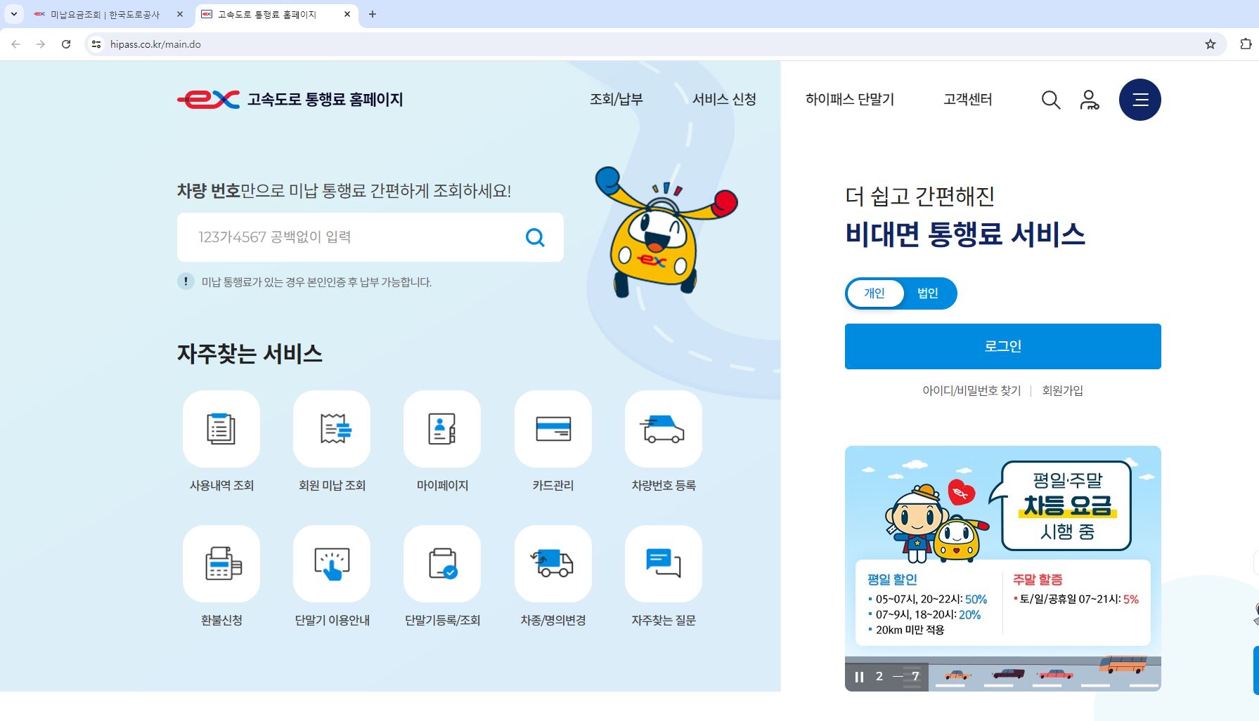 그럼 고속도로통행료 홈페이지로 연결이 되면서 새로운 창이 나옵니다.